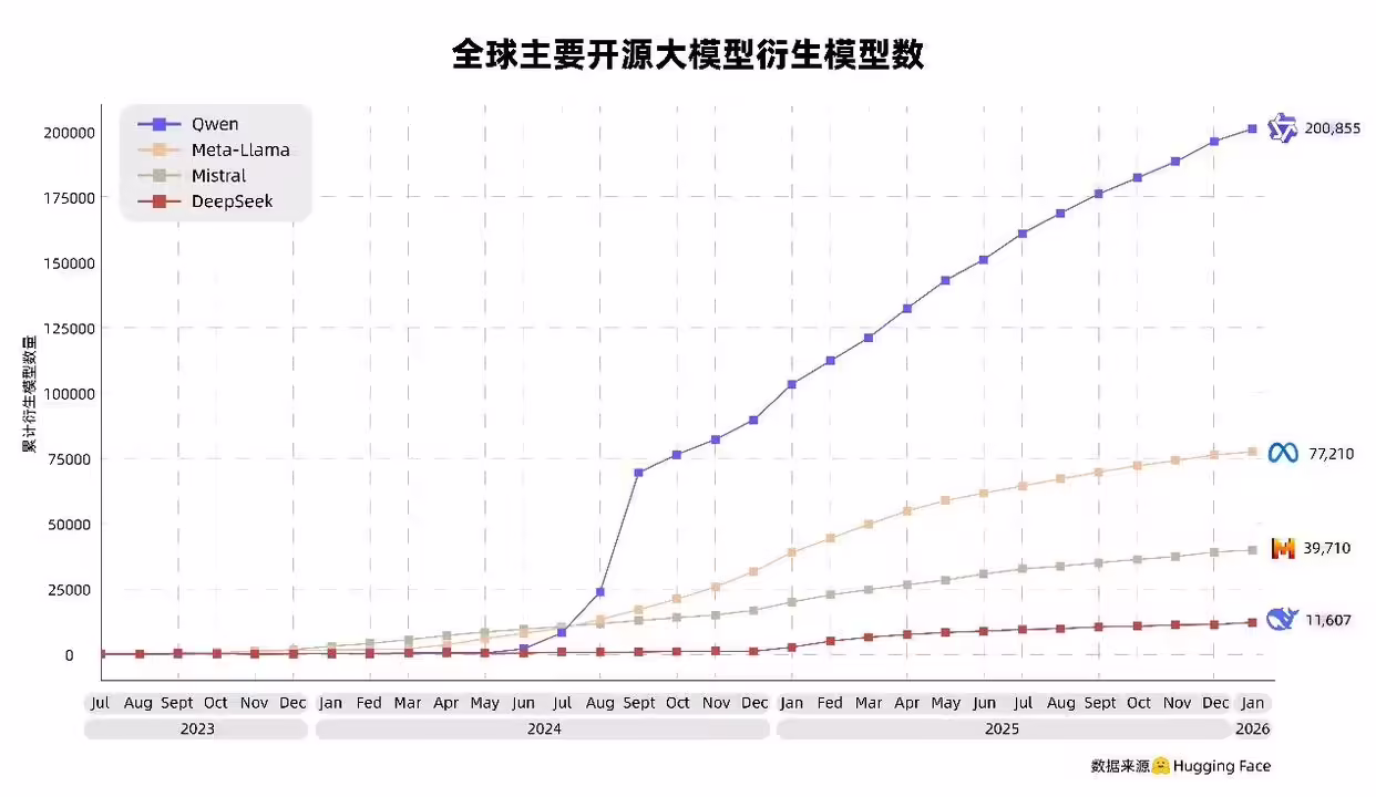 1 月 21 日消息,全球最大 AI 开源社区 Hugging Face 最新数据显示,阿里千问衍生模型数突破 20 万个,成为全球首个达成此目标的开源大模型;同时,千问系列模型下载量突破 10 亿次,平均每天被下载 110 万次,已完全超越美国 Llama,居开源大模型全球第一。